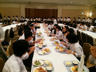 参加生徒全員が元気に2日目の朝をむかえ、朝食中です。しっかり栄養をとって、今日1日の班別分散学習にのぞみます。