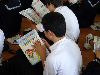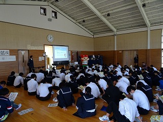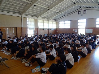 本日3年生を対象に、三重県地域連携部国体・全国障害者スポーツ大会局競技力向上対策課の方々に来ていただき、2021年に三重県で開催される三重とこわか国体と三重とこわか大会の紹介をしていただきました。お話いただいた中でのキーワードは「みんなで参加できるのが国体『する』『みる』『ささえる』」でした。3年後、この中から選手として活躍してくれる人もいるでしょう。また、三重県の代表選手を応援したり、トップアスリートの試合や演技を間近で見ることもできたりします。さらに、開閉会式のサポートや競技の補助員として参加もできるということでした。
