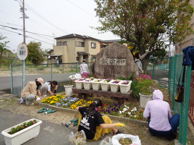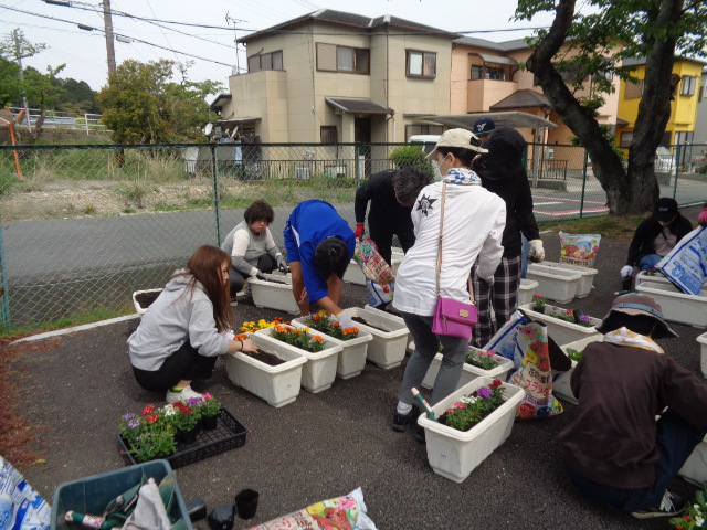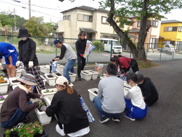 昨年度までPTAで行っていたフラワーオアシスに替わり、今年度から、校舎周りに花を植える活動が始まりました。土曜日には、PTA環境部さんが集まって、西門周辺に植栽をしていただきました。
