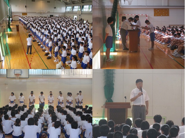 今日は、夏季休業中の生徒の生活と学習の状況を把握するために、設定した登校日でした。一部、大会の重なった部活動を除き、ほとんどの生徒が元気な様子を見せてくれました。1限目の全校集会では、運動部の中体連三泗地区予選と県大会及び吹奏楽部のコンクールの表彰を行いました。今年度は、特にたくさんの部活動が県大会出場するなどの好成績を残してくれました。残り約2週間、健康に留意して過ごすとともに、どの学年も2学期に向けてしっかりと準備していってほしいと思います。
