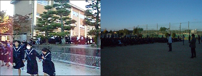 昨日、本年度2回目の避難訓練を行いました。今回は、清掃後の時間に、震度6強の大きな地震が発生したという想定で、生徒と職員に抜き打ちで行いました。最も早く避難・整列・点呼できた学年が2年生で、4分10秒でした。1学期より20秒ほど縮まりましたが、まだグランドに出て歩いていたり、笑っていたりして真剣さに欠けるところがありました。東海・東南海地震は、いつ発生してもおかしくない状況だと言われています。1に自助、2に共助の精神で、被害を少しでも減らせるよう日頃から備えておく必要があります。なお、第3回目を3学期に実施する予定です。次回は、全学年4分を切ることを目標にしましょう。