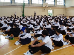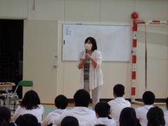 本日、1年生で地域理解学習の現在分野として、コミュニティスクール運営委員の小崎万理子さんを講師にお招きして、朝明中学校区で行われている行事や運営組織についてお話をしていただきました。