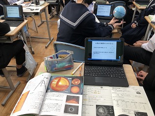 理科では、太陽の黒点について学習していました。黒点の位置が移動していたり、周辺部で楕円に見える理由を周囲と話し合っていました。