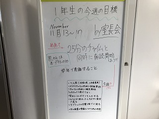 最後は、掲示物の紹介です。1年生のお知らせボードです。室長会からの連絡で、1日の生活の中で時間を守ることについて、呼びかけていました。このことは生活委員会を中心に現在、全校で取り組んでいます。時間を守ることは、信用につながりますね。大切なことです。