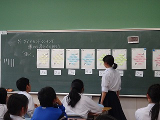 「もし自分が働く場合、どんな条件で働きたいですか?」この質問を皮切りに、道徳の授業が始まりました。今日は「ダイヤモンドランキング」と題して、働くことの意義や自らの進路、将来について考えました。