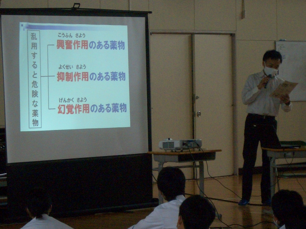 10月1日(金)5限目に四日市北警察の方に来ていただいて、「薬物乱用防止教室」を実施していただきました。「自分の身近ではないもの」と感じている人も多いかもしれんせんが、「いろんな方法で中学生にも忍び寄ってくるもの」と教えていただきました。