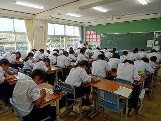 現在2年生は、総合的な学習の時間の中で職場体験に向けて授業を進めています。11月に職場体験を控え、これまでぼんやりとしていたものがNHKにんげんドキュメント「大人ってすごい~14歳の職場体験~」という番組を視聴したことで、職場体験の意義や働くということを具体的に考えるきっかけとすることができました。また体験先が決まり、決意文も書きました。今後、体験先のことを詳しく調べたり、事前の準備をしたりと、職場体験当日に向けて授業が進んでいきます。2年生のみなさん、職場体験に向けて、日々の学校生活から意識を高くしていきたいですね。そして何よりも今年度、君たちの職場体験を快く引き受けていただいた多数の事業所の方々に感謝の気持ちを忘れずに当日を迎えてほしいです。