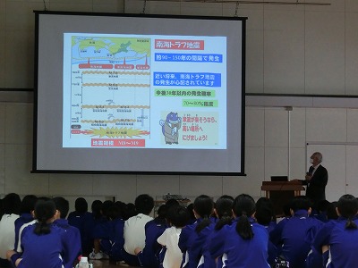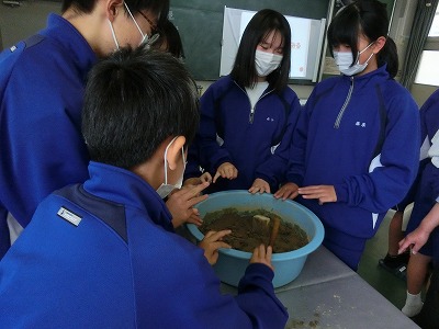 今日の午前中は、1年生全体を6グループに分けて、さまざまな分野から防災について学ぶ防災学習を行いました。液状化現象が起きる実験をしたり、実際の地震の揺れを感じてみるなど、さまざまな体験もしました。自分の住んでいる地域の地震発生確率の予想が低くても注意が必要なことや、朝明中学校の近くにも活断層があることなども教えてもらいました。自分の身は自分で守り、災害があったらお互いに助け合えるように、ふだんから準備・協力していきましょう。
