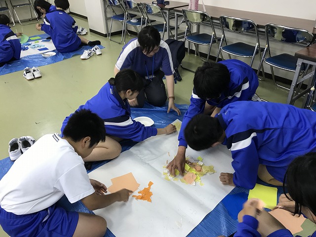 3日目は創作活動をしました。クラスで考えた学級目標を壁画にし、教室の後方に飾ります。各クラスいい学級目標壁画ができました。