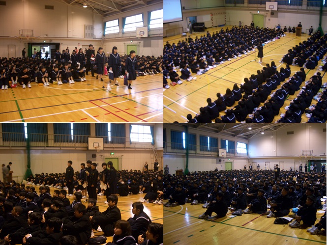 本日、1限目に昨日入学した1年生と2・3年生との対面式を行いました。2・3年生が1年生を拍手で迎え入れ、対面後に生徒会会長の木村菜月さんが歓迎の言葉を述べました。続いて6名の前期生徒会本部役員が、中学校の1年間の行事や部活動、学校生活のルール等について、スライド画像や手作りの動画を用いて説明しました。1年生の子どもたちは、これから始まる学校生活への期待に目を輝かせながらしっかりと聴き見ていました。
