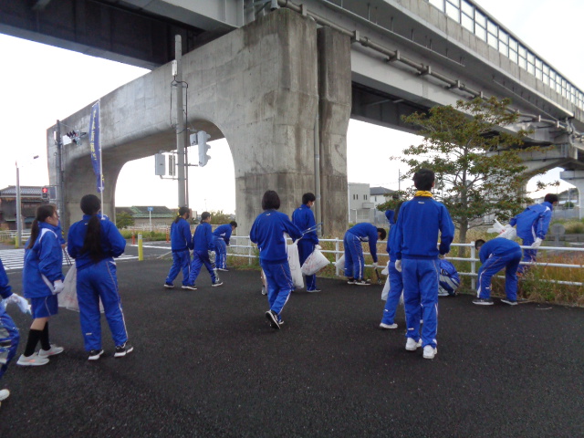 2,3,4組は、中学校を出発し、富田山城線の歩道を掃除しました。