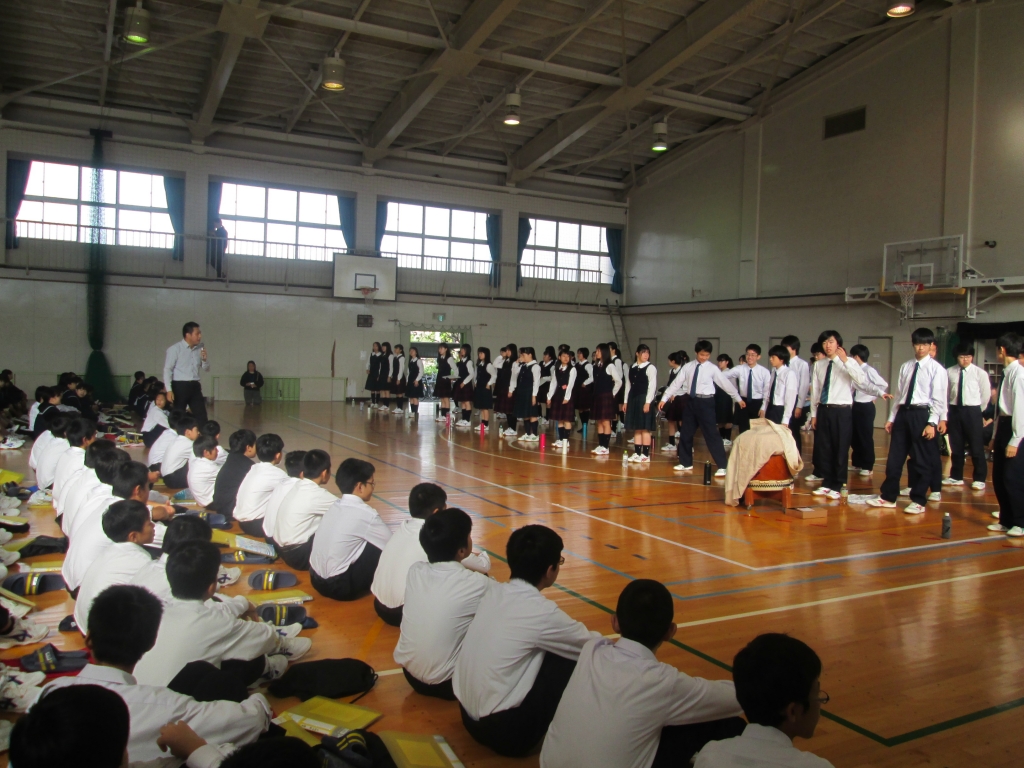暁高等学校合唱部の皆さんが一年生の合唱曲を模範演奏していただきました。