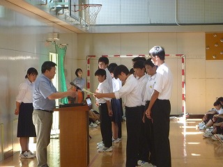 自分も頑張ろう!と奮い立ってくれたことでしょう。今週末からは、中体連が始まります。3年生にとってはこの中体連が最後です。2年生にとっては、3年生と参加する最後の中体連です。1年生にとっては、応援を頑張りながらも、先輩方の雄姿を目に焼き付け、上級生になったときに後輩のお手本となることができるようになりましょう。その他にも皆さん、思い思いの夏休みを過ごすことでしょう。色々な経験をして成長した姿を夏休み明けに見ることができることを楽しみにしています。