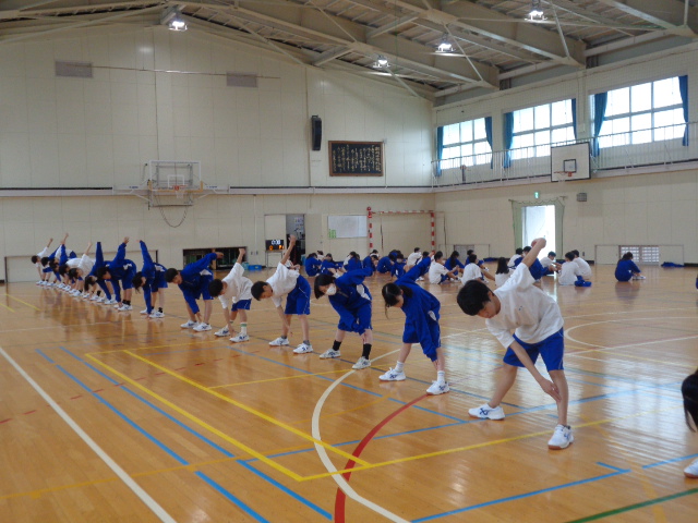 体育館では、1年生が朝明中名物リズム体操のテスト。