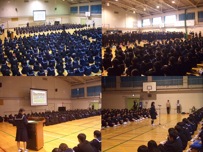 本日、1限目に、新入生と2・3年生の対面式を行いました。最初に2・3年生が1年生に校歌を披露しました。続いて、生徒会長の宮田航汰さんの歓迎のあいさつの後、新入生の代表生徒が決意の言葉を述べました。さらに、生徒会本部が朝明中学校のルールについて、自作の動画を用いて新入生に分かりやすく説明し、中学校3年間で学習する体験活動や行事及び部活動について自作のスライドを用いて説明しました。新入生たちは皆、目を輝かせて真剣に聞き入っていました。