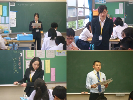 9日(月)から、4人の卒業生が教育実習に来ています。写真の左上から3年生6組の学級指導と3年生の社会科の授業を担当していただく加藤まいさん、右上が3年生4組の学級指導と3年生の美術科を担当していただく谷脇伽奈さん、左下が、1年2組の学級指導と1年生の音楽科を担当していただく淺川みなみさん、2年2組の学級指導と2年生の国語科を担当していただく田村真海(まさみ)さんです。田村さんが2週間、他の3名は3週間の実習となります。年齢が近いこともあり、生徒たちも親しみを持って話しかけています。短い期間ですが、授業以外でも様々な場面で生徒との関わりを持ち、充実した実習にしてほしいと思います。また、数年後に、四日市市の教員として再会できることを期待するとともに楽しみにしています。