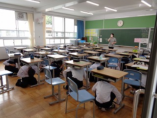 地震が来たことを想定して訓練を行いました。放送が流れた後に、すぐにみんな机の下に入ることができました。