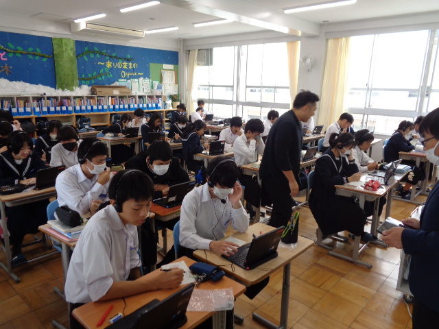 3年生の数学は図形の単元。三角形の合同を学習しています。今日は、ペア学習の話し合いを文字にして振り返る活動を取り入れていました。マイクを通して言葉がGoogleドキュメントに記録されていきます。文字化することで思考が整理され、見通しが持てるようになる…はず。この取り組みに効果があるかどうか、市教育委員会の方も入り授業手法について検証していきます。
