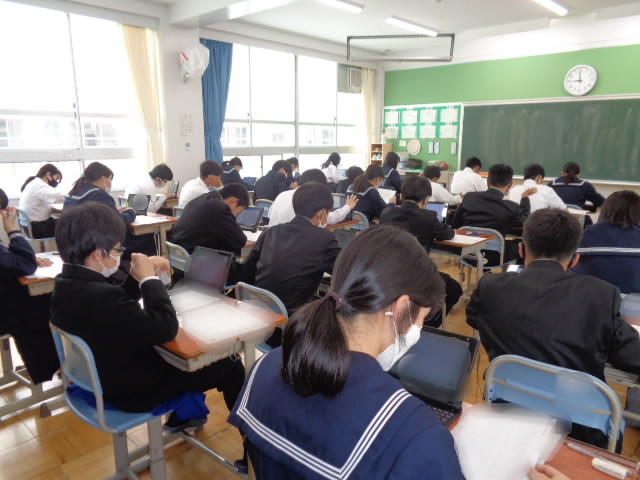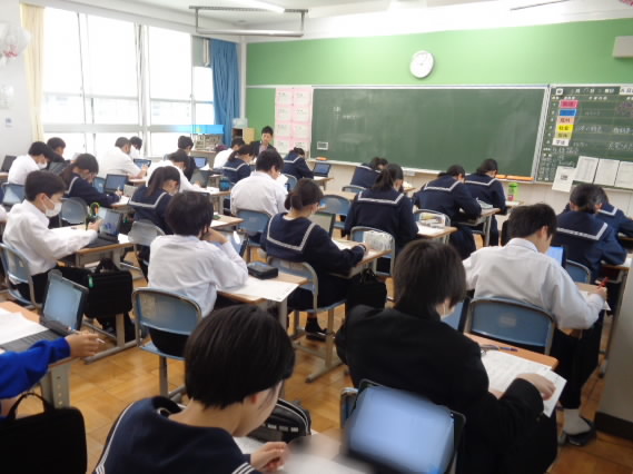 今日は朝から3年生が全国学力学習状況調査に、また、2年生はみえスタディチェックに、それぞれ挑みました。このうちいくつかの調査はCBT(タブレットで回答)形式で行いました。
