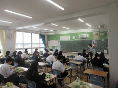 学年によっては再びインフルエンザなどの感染症に罹患している生徒が増えてきました。写真はある学年の本日の給食の様子です。班隊形ではなく、全員が前を向き静かに給食を食べています。明日から随分寒くなるようです。体調管理には気をつけましょう。また、大雪等に関する登下校については左側メニューの「緊急連絡・災害時の対応」を確認ください。