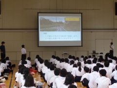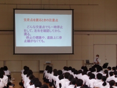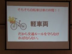 交通マナーについてお話をしていただきました。また、実際の事故の話や、自分が事故の加害者になってしまったらという話をしていただき改めて自分たちの自転車の乗り方や、交通安全に対する意識を考えることができました。