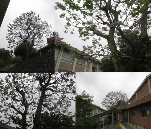 本校体育館の北西の敷地内に10メートルを超える大きな木が1本あり、今、薄紫の綺麗な花を咲かせています。職員も子どもたちも普段あまり意識することがなく、何の木かほとんど知られていませんが、実は「桐」(きり)の木なのです。桐の木は、日本国内でとれる木材としては最も軽く、湿気を通さず、割れや狂いが少ないという特徴があり、高級木材として重宝されてきました。日本では箏(こと)や箪笥(たんす)の材料として用いられることが多く、桐箪笥といえば高級家具の代名詞でした。また、桐は成長が早いため、かつて日本では女の子が生まれると桐を植え、結婚する際にはその桐で箪笥を作り嫁入り道具にするという風習もありました。最近では、「このような立派な桐の木は珍しい」と剪定の植木職人さんから言われました。みなさんも少し意識して桐の木と綺麗な花を見てみてください。