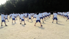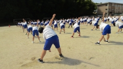 今日はお天気にも恵まれ、各学年の学年練習をグランドで行いました。3年生はチャイムが鳴る前に整列も完了し、スムーズにスタートできました。最初は朝明中学校伝統のリズム体操。さわやかな風が吹く中、まずは準備運動です。体全体を使って行うので、5クラス全員で行うと迫力もありますね。