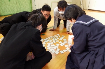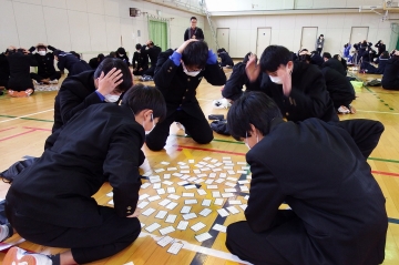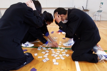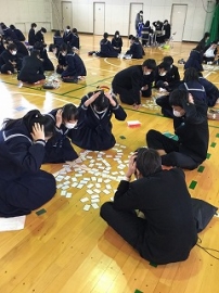 1月18日、新春百人一首大会~学年Ver.~が行われました。対戦相手は昨年度の大会成績や経験等から編成され、寒い体育館が熱くなるほど白熱した戦いが繰り広げられました。結果は…優勝 2組、準優勝 5組、3位 3組!個人では60枚以上とった強者もいました。