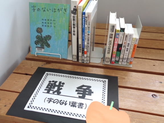 「字のない葉書」を学ぶ2年生には戦争に関する本のコーナー。