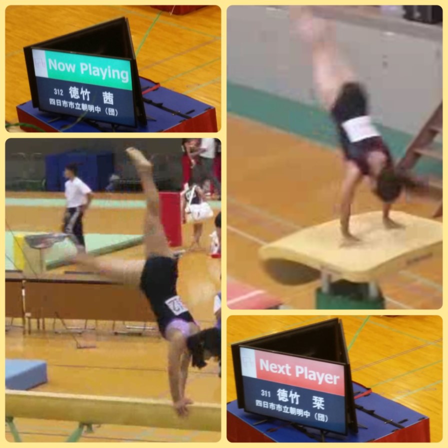 去る7月1日(土)に平成29年度三重県中学校総合体育大会体操競技が中央緑地体育館で開催されました。本校からは3年生の徳竹栞さん、徳竹茜さん、1年生の小寺遥歌さんの3人が団体戦に出場し、跳馬、平均台、床の団体種目と段違い平行棒の4種目の演技をしました。東海大会進出は逃しましたが、テレビ中継で見るような大会で、生き生きと演技していました。