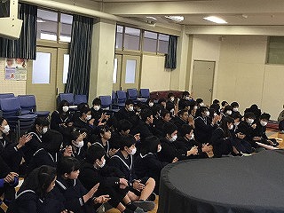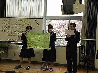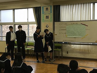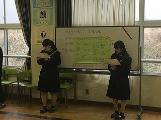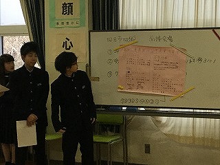 2年生では来年の受験に向けて進路学習を行っています。班で2校ずつ高校を調べ、調べた内容を2クラス合同で発表しあいました。まだ明確に自分の進路について考えられなくても、この機会に幅広い視野で進路について考えていってほしいと思います。
