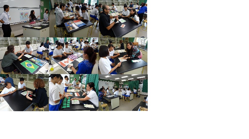 ”Let's travel around the world.”と題した授業では、12か国を旅し、入国審査を受ける場面を取りあげ、入国審査官とのやりとりを英語でおこなう活動をしました。パスポートを見せたり、滞在期間を答えたりするなど、現実に近い場面で会話をしていました。