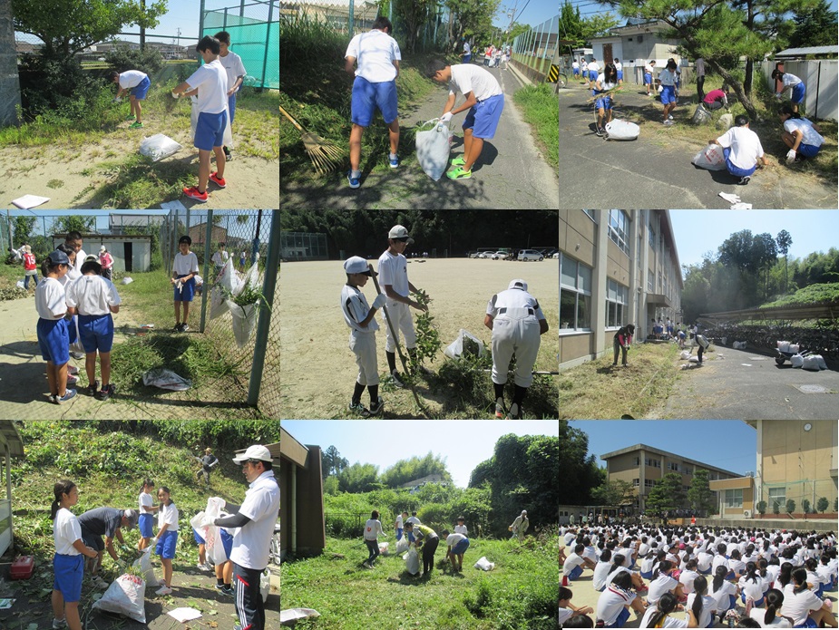 本日、PTA環境整備部主催の除草作業が行われました。約430名のボランティアの生徒と100名のPTA役員さん・委員さんと保護者の方が参加し、まだまだ夏の日差しが残る暑さの中でしたが、生徒は部活ごとに保護者の方は学年ごとにそれぞれの担当区域を2時間しっかり除草していただき、ゴミ袋750袋もの草や木枝等が集められました。おかげで、美しい環境で13日(水)予定の体育祭を迎えられます。参加していただいた生徒・保護者の皆様ありがとうございました。