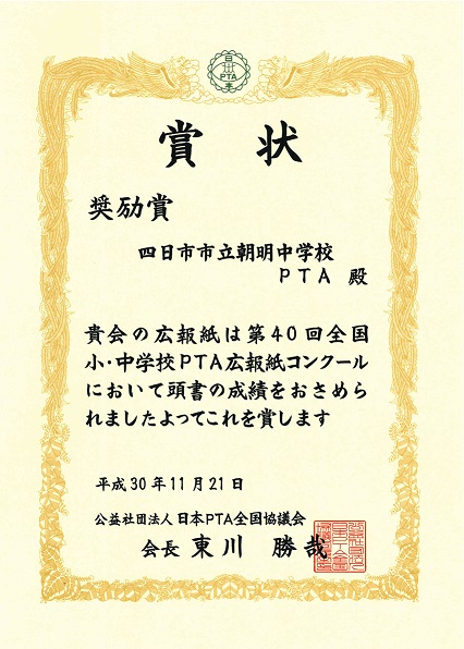朝明中学校PTA 広報部の方々が苦労して作っていただいた広報紙が、第40回全国小・中学校PTA広報紙コンクールにおいて、奨励賞をいただきました。