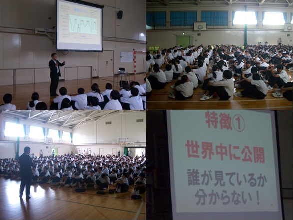 本日、中間テスト終了後の4限目に、四日市市こども未来部、青少年育成室より藤田貴大先生をお招きし、全校生徒を対象に「eネット安心講座」を実施していただきました。先生から、ネット依存は、自分の意志で止めることができず、朝起きられず成績が下がる、家族や友人とのトラブルが起きる、課金請求など、生活面・学習面・社会面・金銭面と様々な問題が生じること、インターネットは、世界中のだれが見ているかわからない、情報が不確か、写真などの画像は回収不可能、個人情報が流出する、匿名ではなく発信源を特定できることなどから、誰でも加害者にも被害者になりうることなどについてスライドを用いて分かりやすくお話していただきました。そして、大切な自分や家族・友人を守るためにも、必ずフィルタリング利用することが必要であり、ネットは架空の世界もあることから、あいさつなど実際の人と関わる力をつけることが何よりも重要であることを教えていただきました。この機会にご家庭でもぜひ、話題にしていただければと思います。
