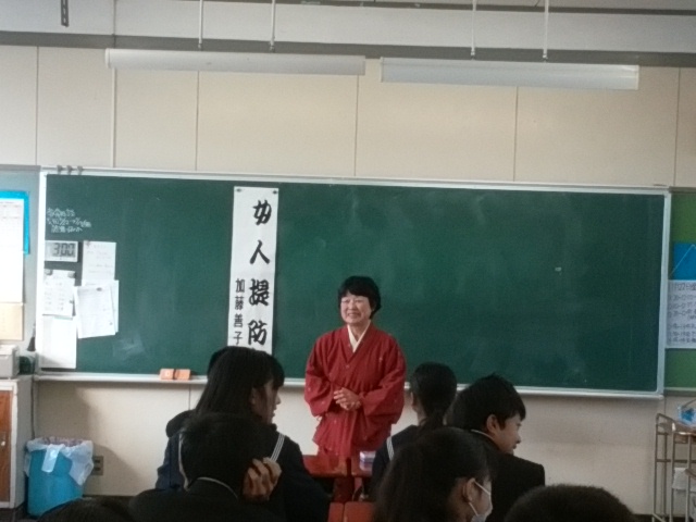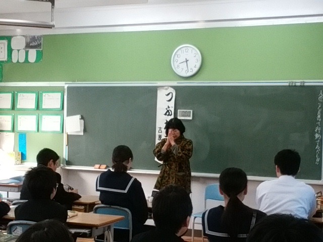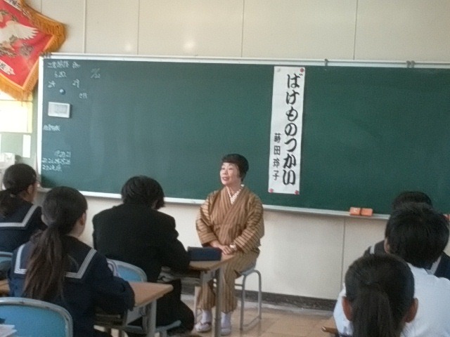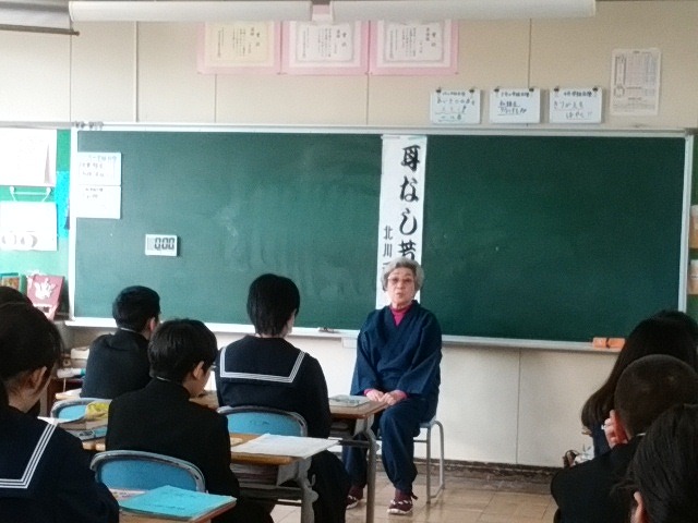 こもの菊の皆さん方による語りに熱心に聞き入る生徒たち