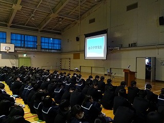本日5・6限目に体育館で全校生徒が集まって学習発表会が行われました。内容は各学年が1年間の総合的な学習の時間で何をおこなってきたかというものでした。3年生は修学旅行の取り組み、地域貢献学習(避難所運営ゲーム(HUG)、地域清掃)についてそれぞれ発表しました。室長のみなさんは緊張しながらも堂々と発表をしてくれました。