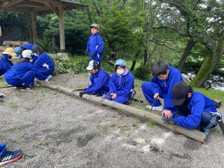 里山保全活動を行いました。大きな木も班やクラスを超えて切り倒し薪にしました。
