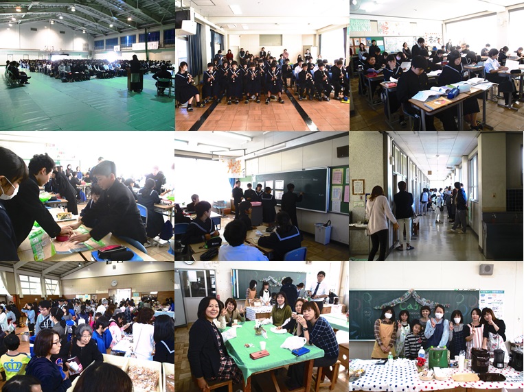 本日、1・2年生は、2学期の授業参観と学年懇談会、3年生は、進路説明会を実施し、大変多くの保護者の方に来校していただきました。また、参観後には、PTA教養部主催のバザーと喫茶コーナーを開設し、こちらも多くの保護者・地域の方で盛況でした。