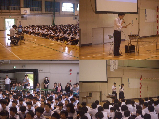 本日、5限目にPTA教養部主催のPTA講演会(子どもの未来を守る会)が行われました。講師の市内在住の東海学院大学大学院生の上田直志さんに、「十人十色~人それぞれの性」という演題で、LGBT(性的マイノリティー)及び性同一性障害について、性は、男と女の2種類ではなく、人それぞれの性があっていいこと、自分らしさを大切にして生きることの大切さ、何よりも周囲の理解が必要であることなどについて、自身の生い立ちや体験を振り返りながら、熱く語っていただきました。期末テスト終了後の大変蒸し暑い体育館の中での講演でしたが、全校生徒と職員・約30名の保護者が、最後まで聞き入っていました。また、講演会終了後に、7月2日(土)から始まる、中体連県大会の体操競技に参加する2名の生徒の壮行会を行いました。 |