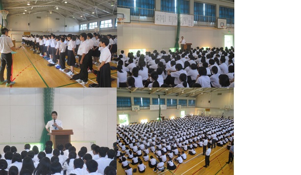 本日、1限目に1学期の終業式を行いました。校長からは、まず、学校づくりで大切にしている、○あいさつ、○時間を守る、○整理整頓、○校歌をしっかり歌う、ことについて、あらためてその意味を話しました。続いて生徒指導の浅野先生から、命の尊さについてのお話がありました。生徒たちは、7月4日からスーパークールビズ期間を過ごしていますが、今日は、式ということで久しぶりに制服を身にまとって入場しました。暑い体育館の中でしたが、どの学年も姿勢が崩れることなくよく集中して話を聴き、退場まで、整然とした雰囲気で式を終えて1学期を締めくくることができました。