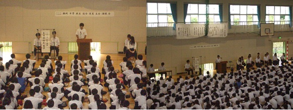 10月5日(月)6限目,後期生徒会本部役員立候補者の立会演説会及び,選挙が行われ,生徒会長・副会長・執行委員が選出されました(写真は立会演説会のようすです。)。