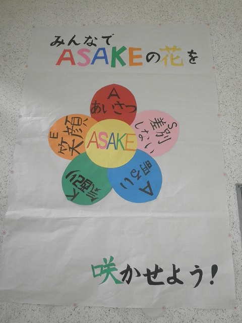 『みんなでASAKEの花を咲かせよう!』A:明るい S:差別しない A:あいさつ K:気配りができる E:笑顔 の5つの花びらが素敵です!この5つの花びらを意識して生活し、たくさんのASAKEの花を咲かせましょう!