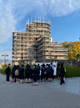 原爆ドームは補強工事中で、おなじみの姿は見えませんが、このような珍しい姿もちょっと記念になりますね。