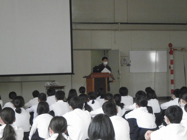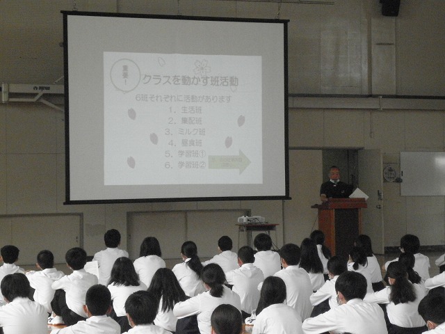 1限目に学年集会を行い、学校生活における係の仕事などを改めて確認しました。そして、担当の先生から、これからの生活で気をつけていくことを話してもらいました。集中して、しっかりと話を聞くことができていましたね。