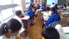 テスト直前の授業では、これまでの確認や、期末テストの練習を兼ねて小テストを行う教科もあります。国語の授業では、小テスト返却を行いました。みんながよくしてしまう間違いを先生が指摘し、確認しました。期末テストで同じミスをしないようしっかり振り返りました。