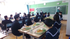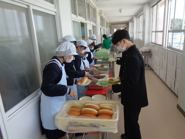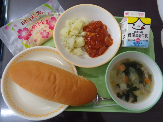 今日のメニューはミルクパン、ハンバーグのトマトソース、粉ふきいも、野菜スープ、お祝いクレープです。中学校のパンの大きさに1年生がビックリ。