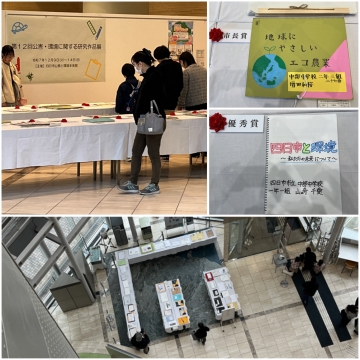 じばさんで開催された「四日市環境フェア」において、「第12回公害・環境に関する研究作品展」の表彰式・研究発表会がありました。2年生の増田さんが取り組んできた「環境」をテーマとした作品が、応募総数約200作品の中から高く評価され、2年連続で最優秀賞の「市長賞」を受賞する快挙を成し遂げました。さらに1年生の山﨑さんも優秀賞を受賞し、中部中からダブル受賞と素晴らしい結果となりました。授賞式には森市長がお越しになり、一人ひとりに表彰状を手渡していただきました。