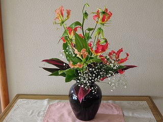 玄関の生け花を活けかえていただきました。今回は、赤と青のドラセナ、グロリオーサ、かすみ草を活けていただきました。玄関が華やかになりました。誠にありがとうございます。