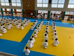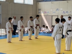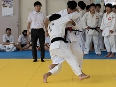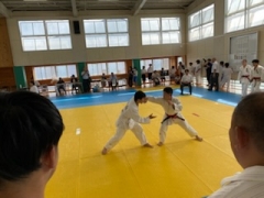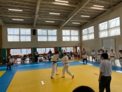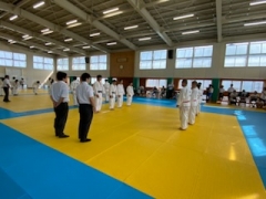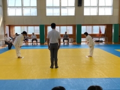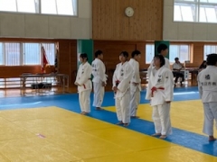 三滝中学校体育館にて柔道部の団体戦の試合が行われています。一回戦の相手は、男子は菰野中、女子は三滝中が対戦相手です。